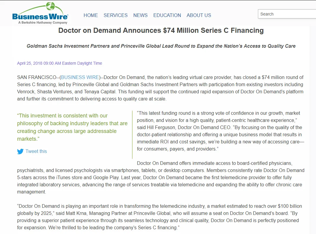 Guest User April 25, 2018 Doctor on Demand Announces $74 Million Series C Financing Guest User April 25, 2018